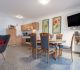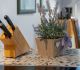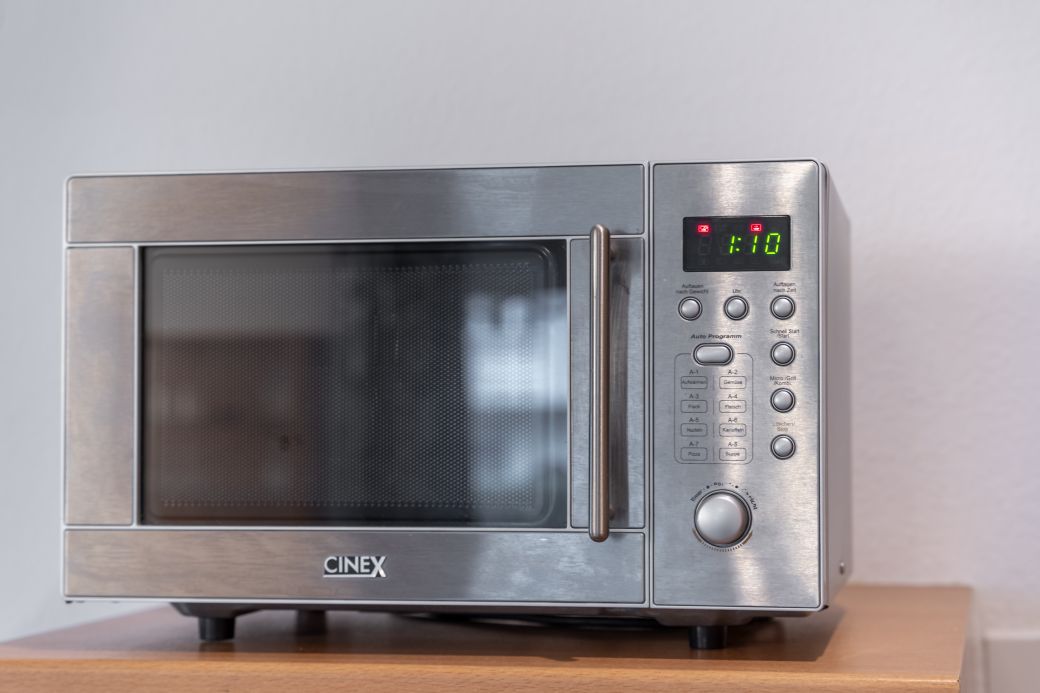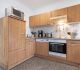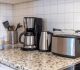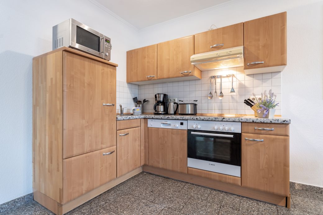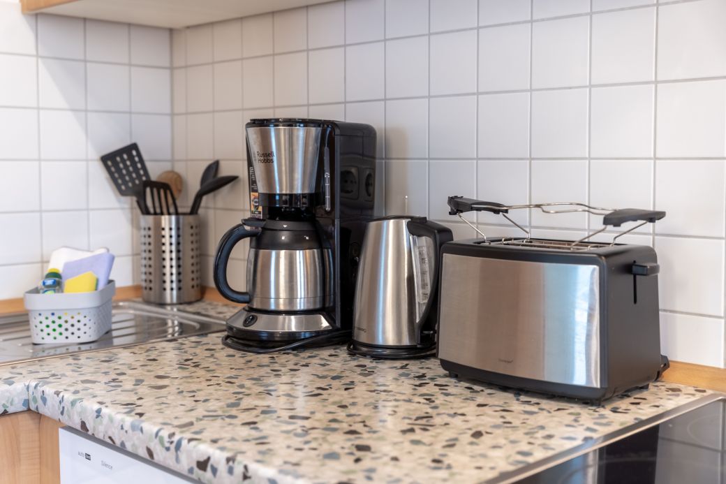 moderne Küchenzeile mit Kühlschrank/Gefrierfach, Spülmaschine, Toaster, Kaffeemaschine, Wasserkocher, Mikrowelle, Mixer, Fön, Bügeleisen und Bügelbrett