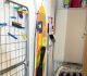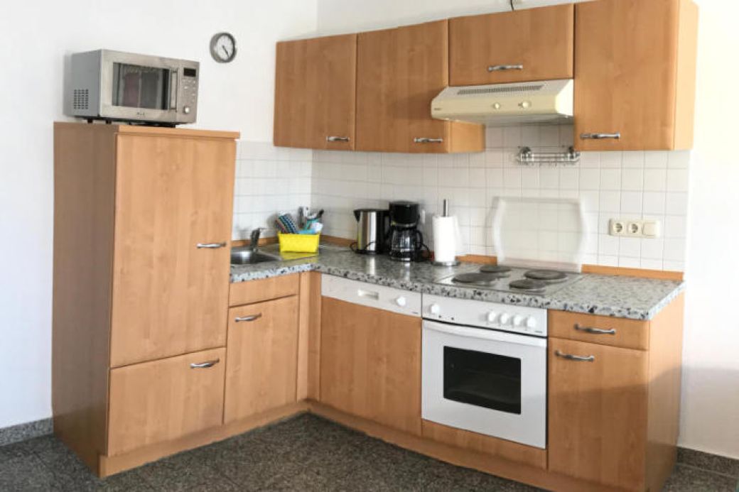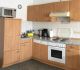 moderne Küchenzeile mit Kühlschrank/Gefrierfach, Spülmaschine, Toaster, Kaffeemaschine, Wasserkocher, Mikrowelle, Mixer, Fön, Bügeleisen und Bügelbrett