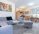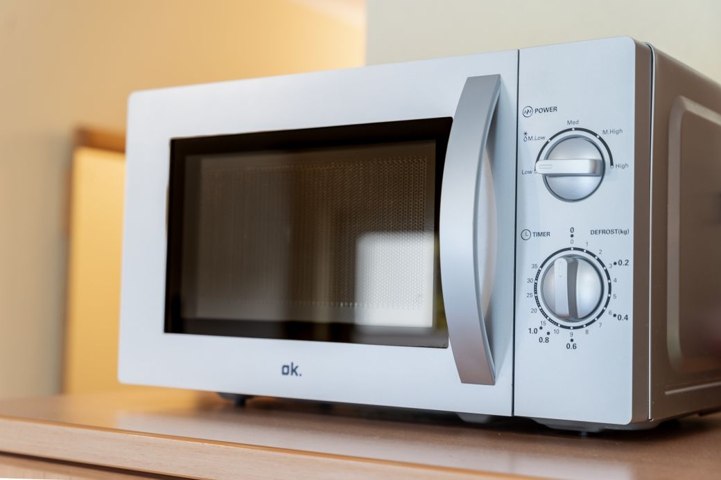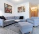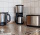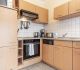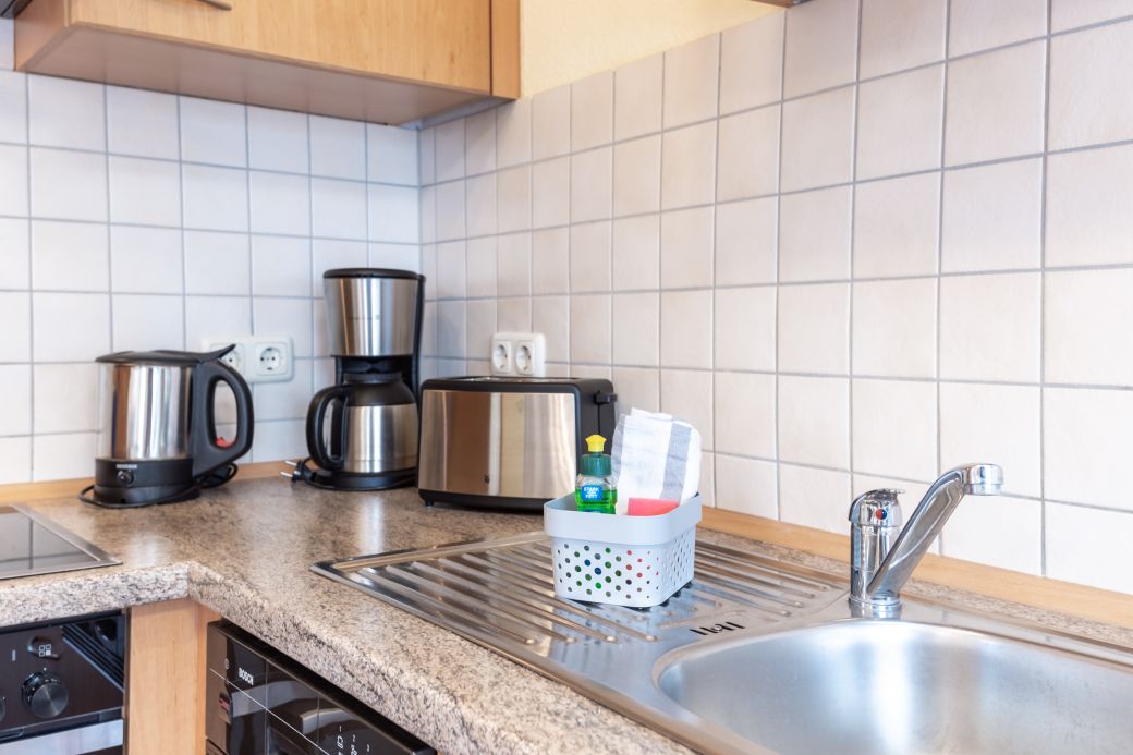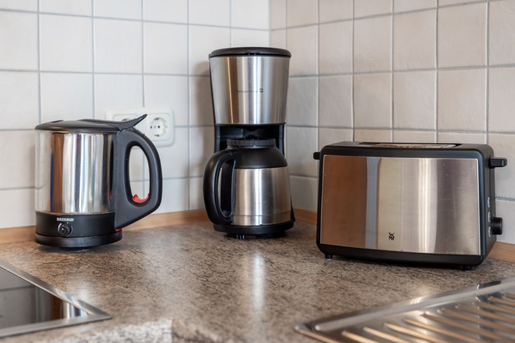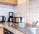 moderne Küchenzeile mit Backofen, Kühlschrank und Gefrierfach, Spülmaschine, Toaster, Kaffeemaschine, Wasserkocher, Mikrowelle, Mixer, Fön, Bügeleisen und Bügelbrett