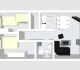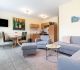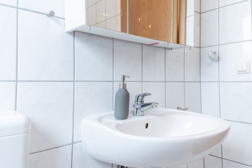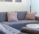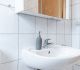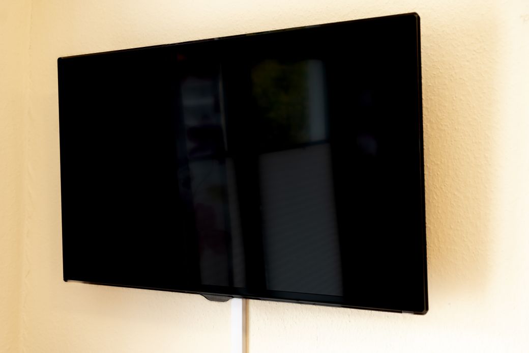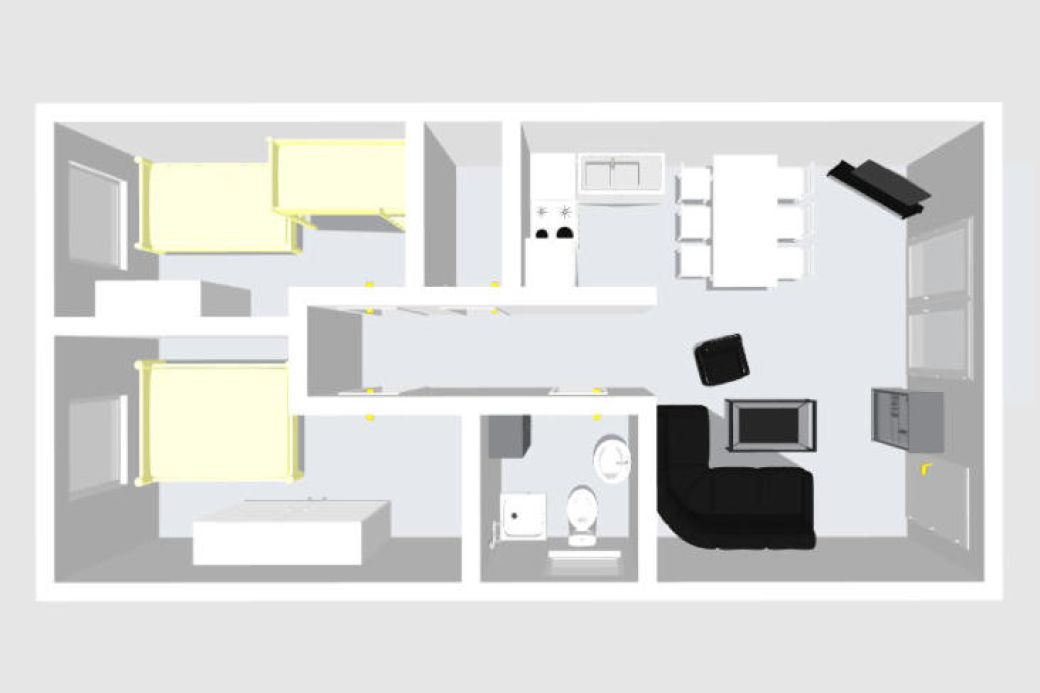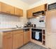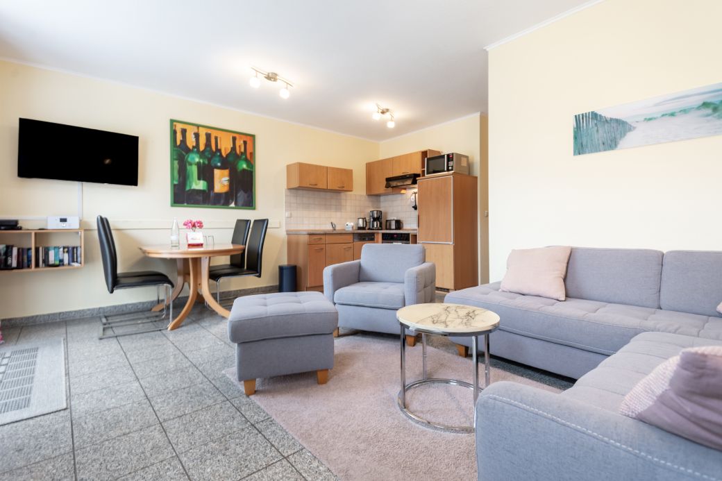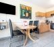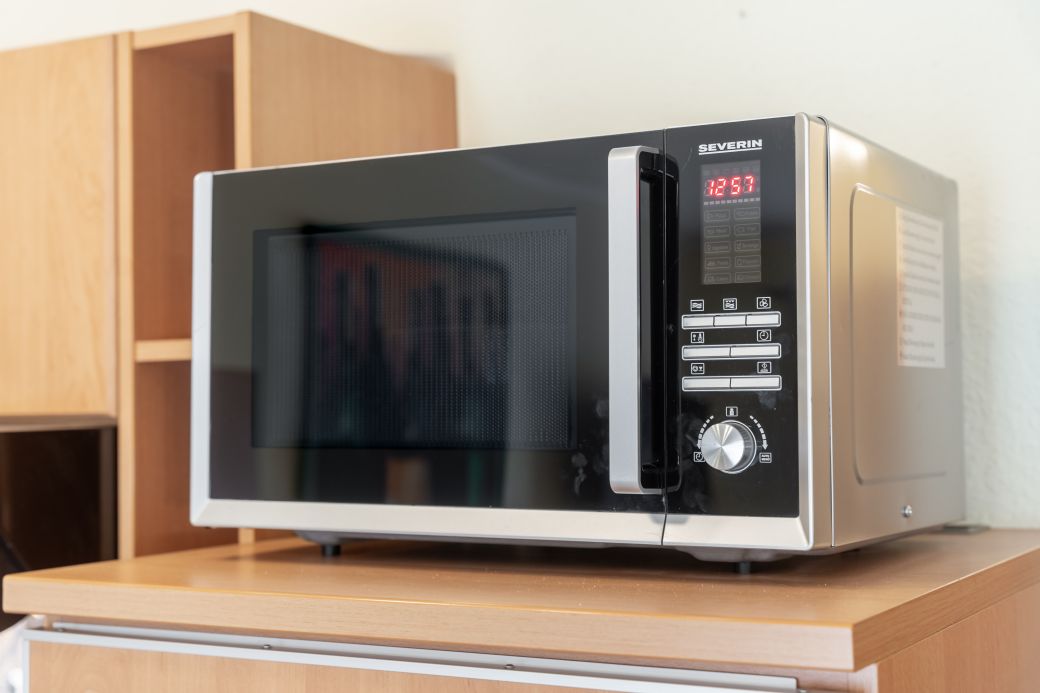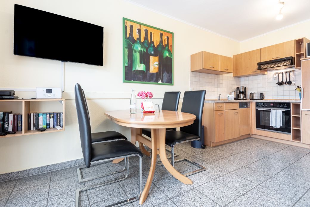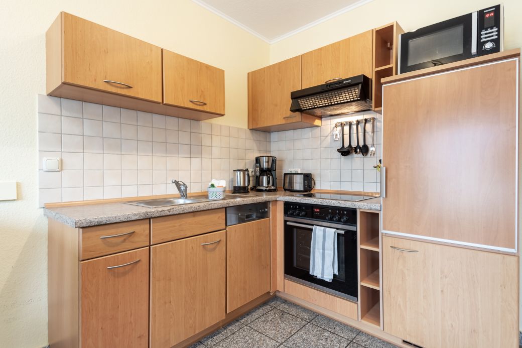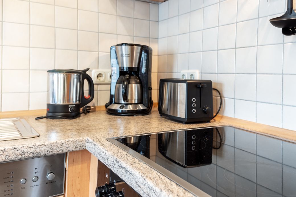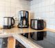 moderne Küchenzeile mit Backofen, Kühlschrank und Gefrierfach, Spülmaschine, Toaster, Kaffeemaschine, Wasserkocher, Mikrowelle, Mixer, Fön, Bügeleisen und Bügelbrett