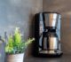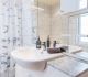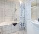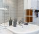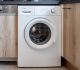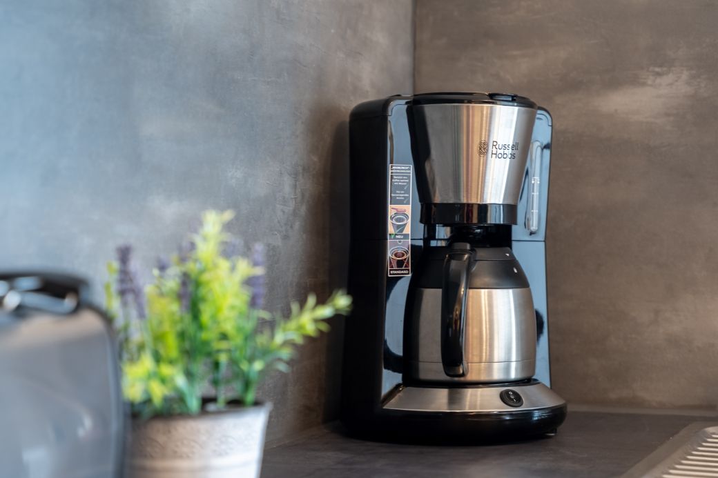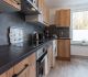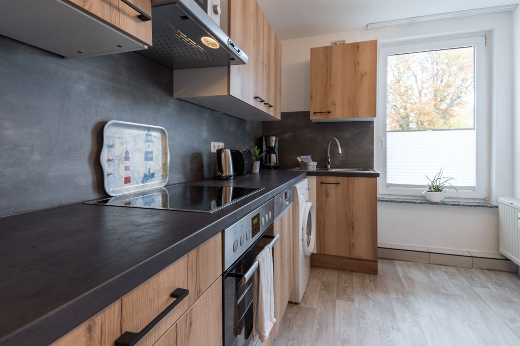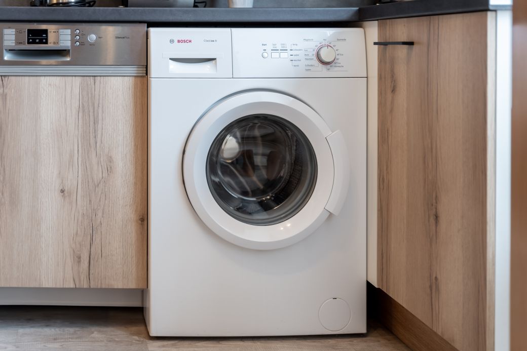 moderne Küchenzeile mit Backofen, Kühlschrank/Gefrierfach, Spülmaschine, Toaster, Kaffeemaschine, Wasserkocher, Waschmaschine, Mikrowelle, Mixer, Fön, Bügeleisen und Bügelbrett.