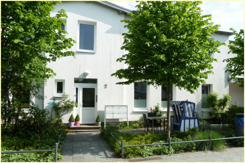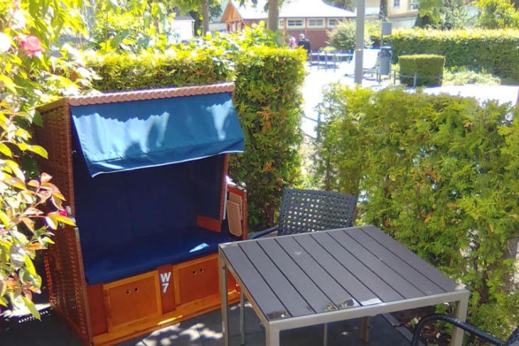 Wohnung in der ersten Etage, Terrasse mit Strandkorb vor dem Haus