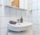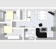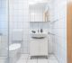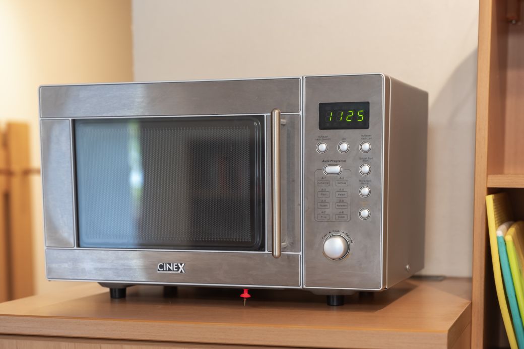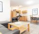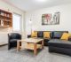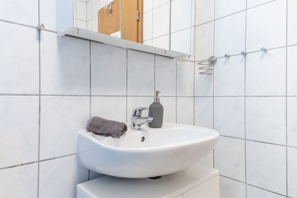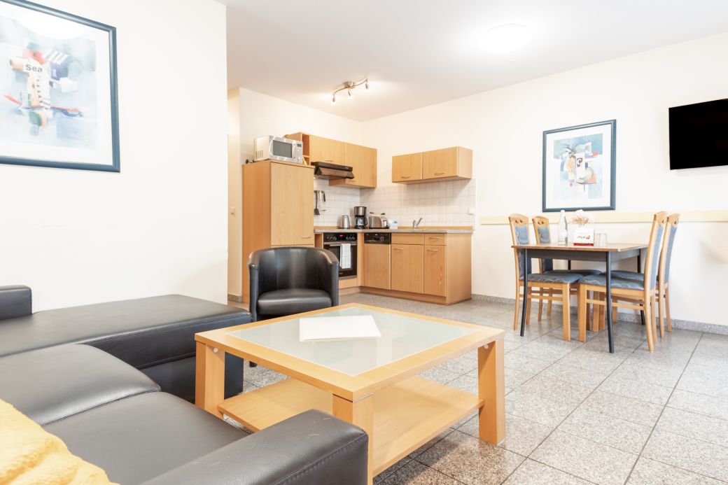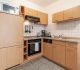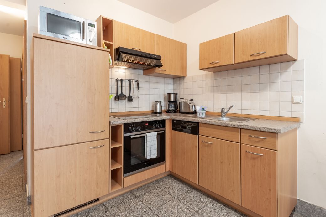 moderne Küchenzeile mit Backofen, Kühlschrank und Gefrierfach, Spülmaschine, Toaster, Kaffeemaschine, Wasserkocher, Mikrowelle, Mixer, Fön, Bügeleisen und Bügelbrett.