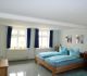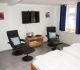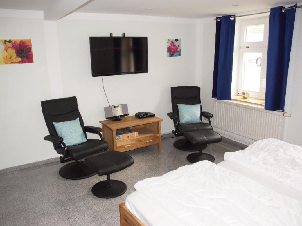 1. Schlafzimmer mit Doppelbett, TV und 2 Relax-Sesseln
